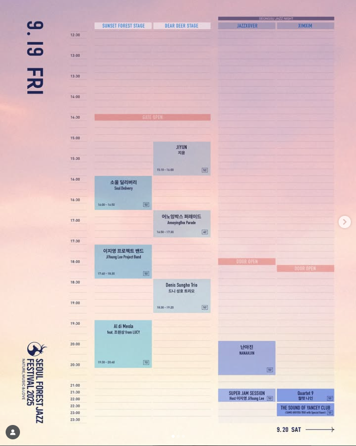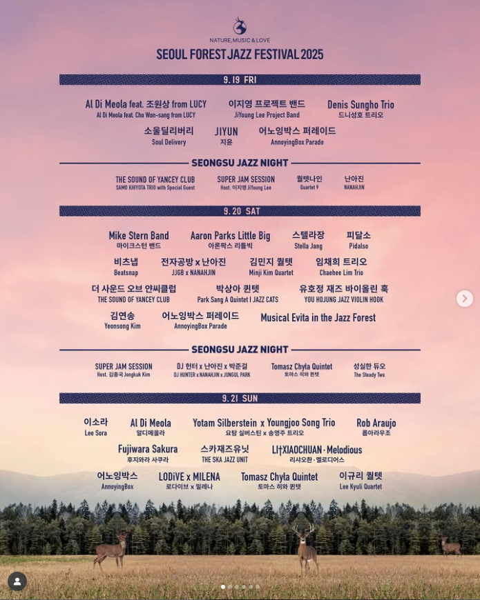헤드라이너의 존재감, 성수동 밤 문화와의 결합, 섬세한 관객 동선. 서울숲재즈페스티벌 2025 라인업은 ‘다른 시즌’과 비교해도 확실한 진화를 보여주는데요~ 하루만 즐길지(1일권), 주말을 통째로 묶을지, 취향과 일정에 맞춰 선택하셔서 즐거운 뮤직페스티벌 되시길 바랍니다. ^^
